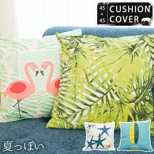 クッションカバー 45×45cm 夏っぽい サーフ フラミンゴ スターフィッシュ ボタニカルリーフ 綿100% ブラウン グリーン ピンク かわいい おしゃれ デザイン 大人