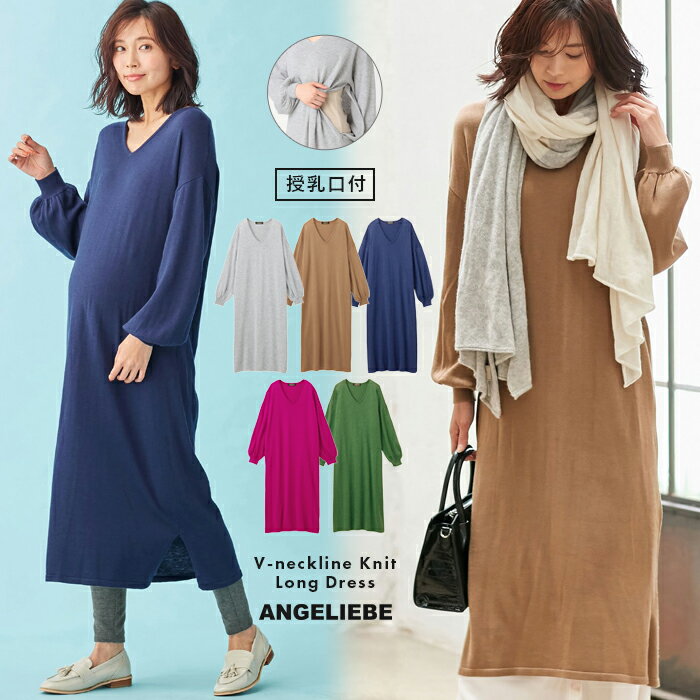 【マザーズセレクション大賞受賞】授乳服 夏 マタニティ ワンピース 【授乳口付】ウール混なめらかニット Vネックパフスリーブロングワンピース【産前 産後 授乳服 妊婦服 マタニティー マタニティワンピース 春 春夏