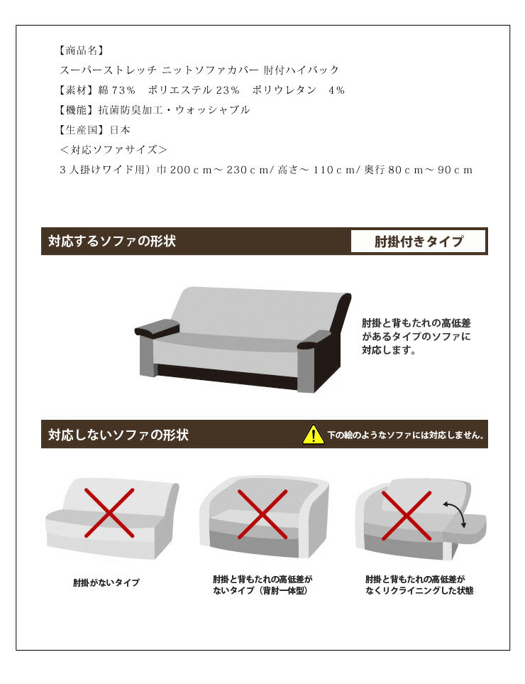 素材:綿73% ポリエステル23% ポリウレタン 4%機能:抗菌防臭加工・ウォッシャブル生産国:日本<対応ソファサイズ>3人掛けワイド用)巾200cm〜230cm/高さ〜110cm/奥行80cm〜90cm【代引きについて】こちらの商品は、代引きでの出荷は受け付けておりません。