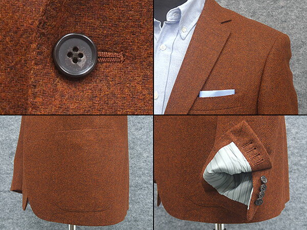 日本縫製 商品詳細 2ボタン:ツイードジャケット 色 赤茶/レンガ色 (霜降り調) 柄 無地調:ダイヤゴナル(綾織) 表地(混率) 毛100% 英国生地使用 裏地 ポリエステル ベント センターベント シルエット 細身 対応季節 総裏地 秋冬春 仕様 衿巾:細め短丈(通常より3cm程度) 見返し:ピンポンステッチ サイド:貼りポケット(タテ21cm×ヨコ17cm) 水牛風釦 袖口本切羽(袖直しできません) 日本縫製 特徴 ハリスツイードは良いんだけど、少し厚すぎるなぁ」と感じる方には、是非オススメしたいライトなツイードです。