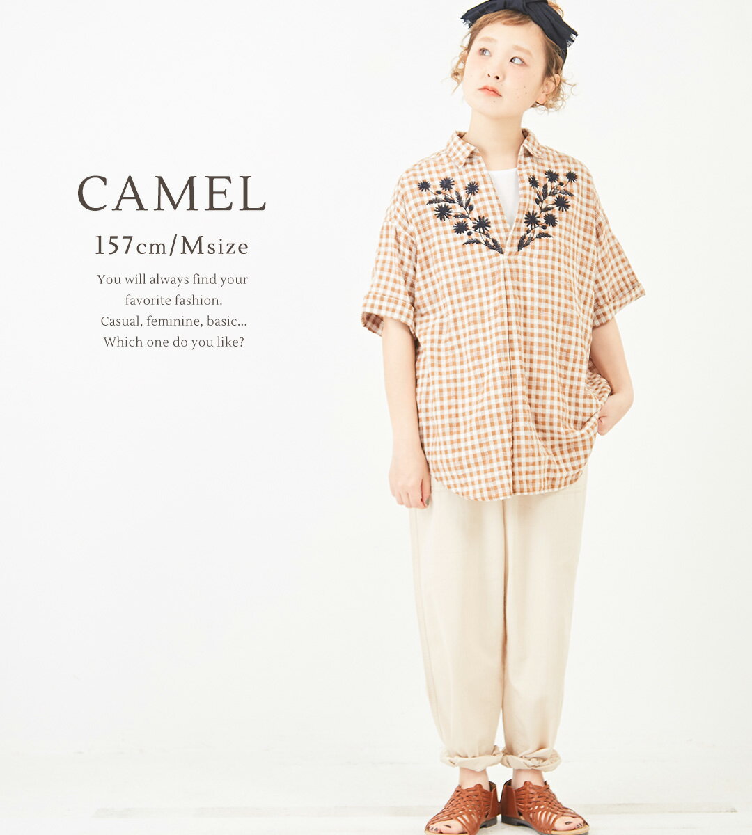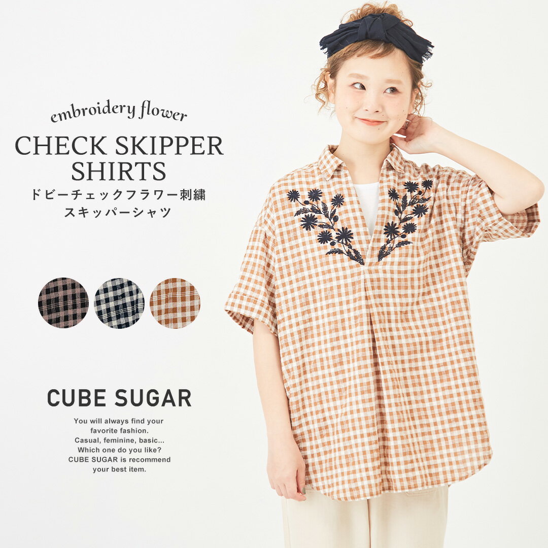 8/1 0:00start クリアランスセール【70%OFF】ギンガムチェックシャツ / 夏新作 / CUBE SUGAR ドビーチェック フラワー刺繍 スキッパーシャツ (3色): レディース トップス シャツ ブラウス 半袖 ギンガムチェック 花柄 刺繍 キューブシュガー